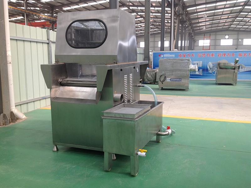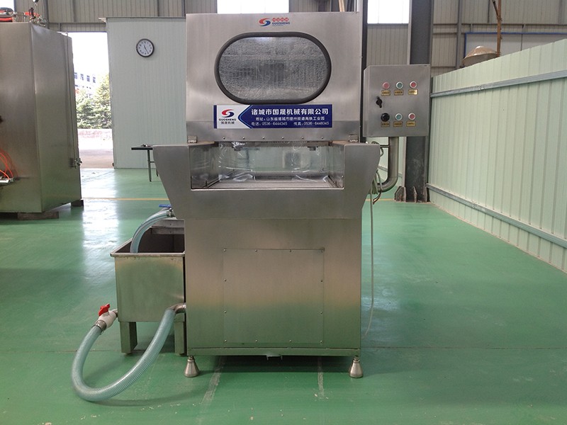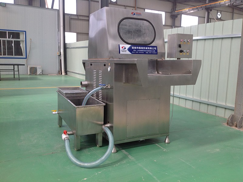 本機可將鹽水及輔料配制的腌漬均勻地注射到肉塊中,縮短了腌漬時間,大大提高了肉制品的口味及出口率??筛鶕?jù)工藝師要求調(diào)節(jié)注射壓力,腌漬劑均勻連續(xù)入肉中,達到理想的注射效果。本機設計嚴謹、結構合理、操作簡便,設有自動保護裝置,當注射針碰到硬物時注射針隨之抬起,不受損壞,是肉制品加工過程中的理想設備。